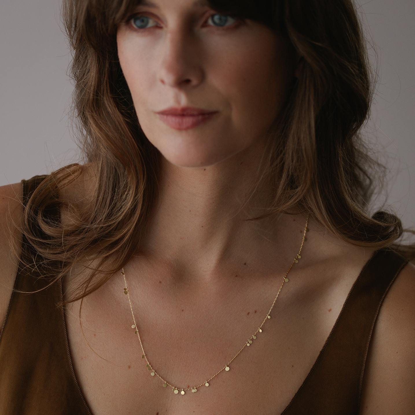 Handmade gold dots of different sizes sitting randomly spaced along a long gold chain.