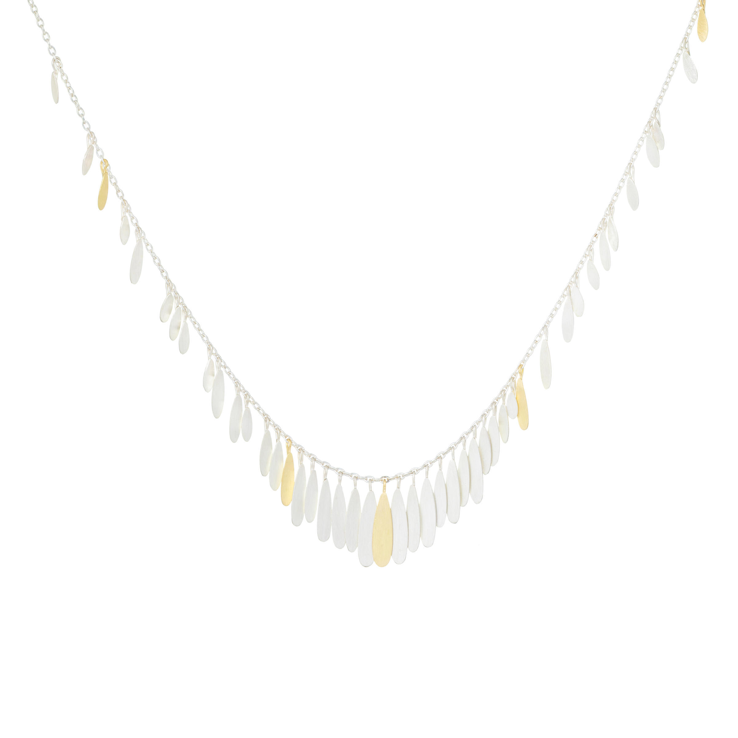 An arc of silver and gold daisy petals dispersing along a fine gold chain.