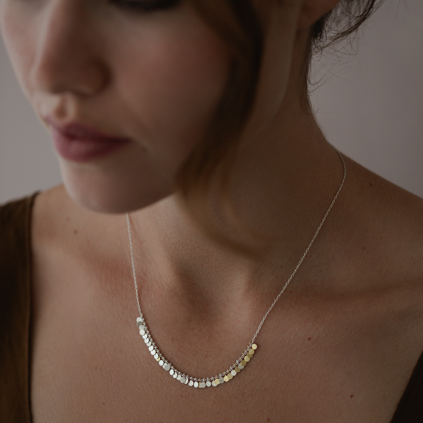 Handmade tiny silver and yellow gold dots, hanging one by one in an arc on a fine silver chain.