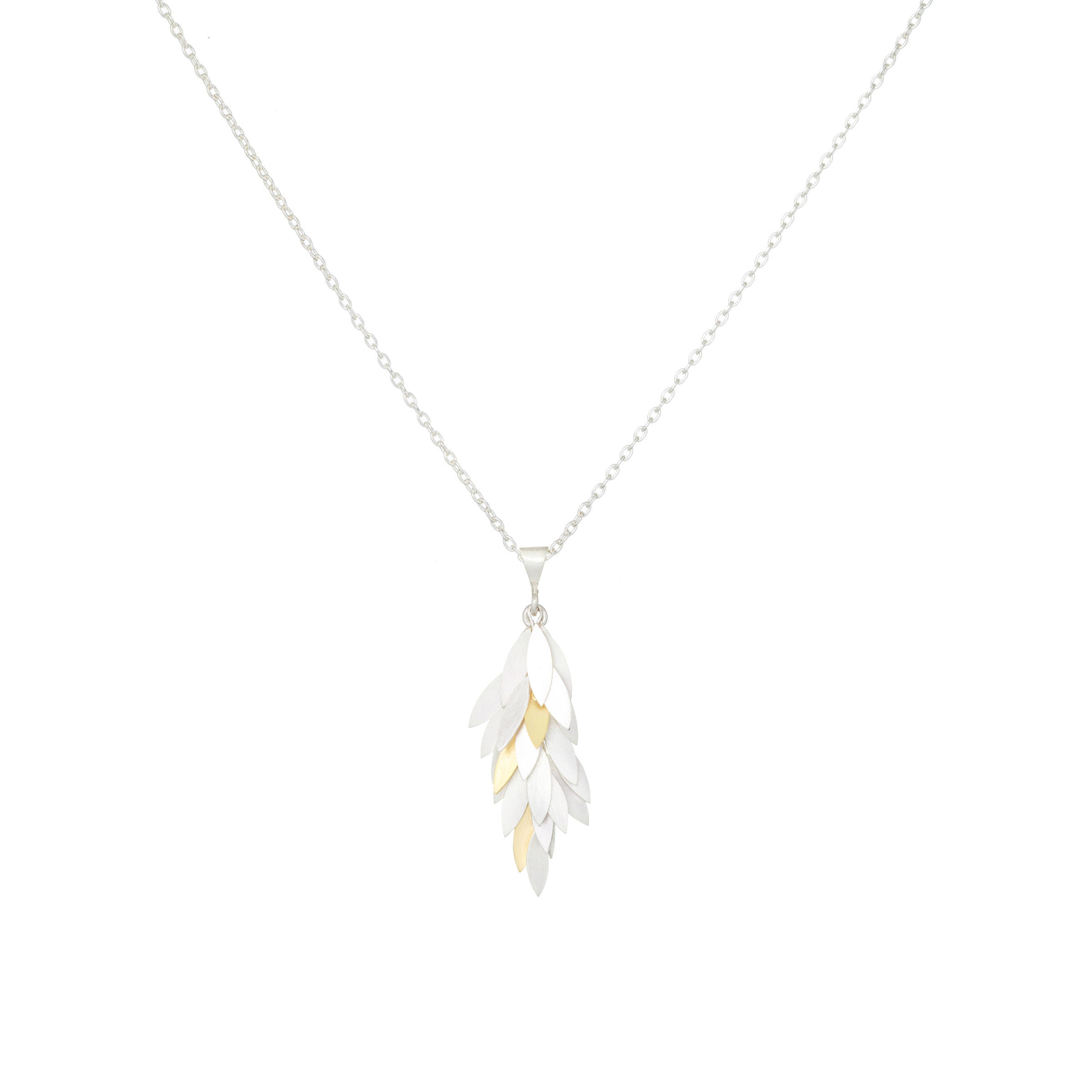 A delicate cluster of silver and yellow gold leaves hanging from a fine gold chain. The leaves move individually.