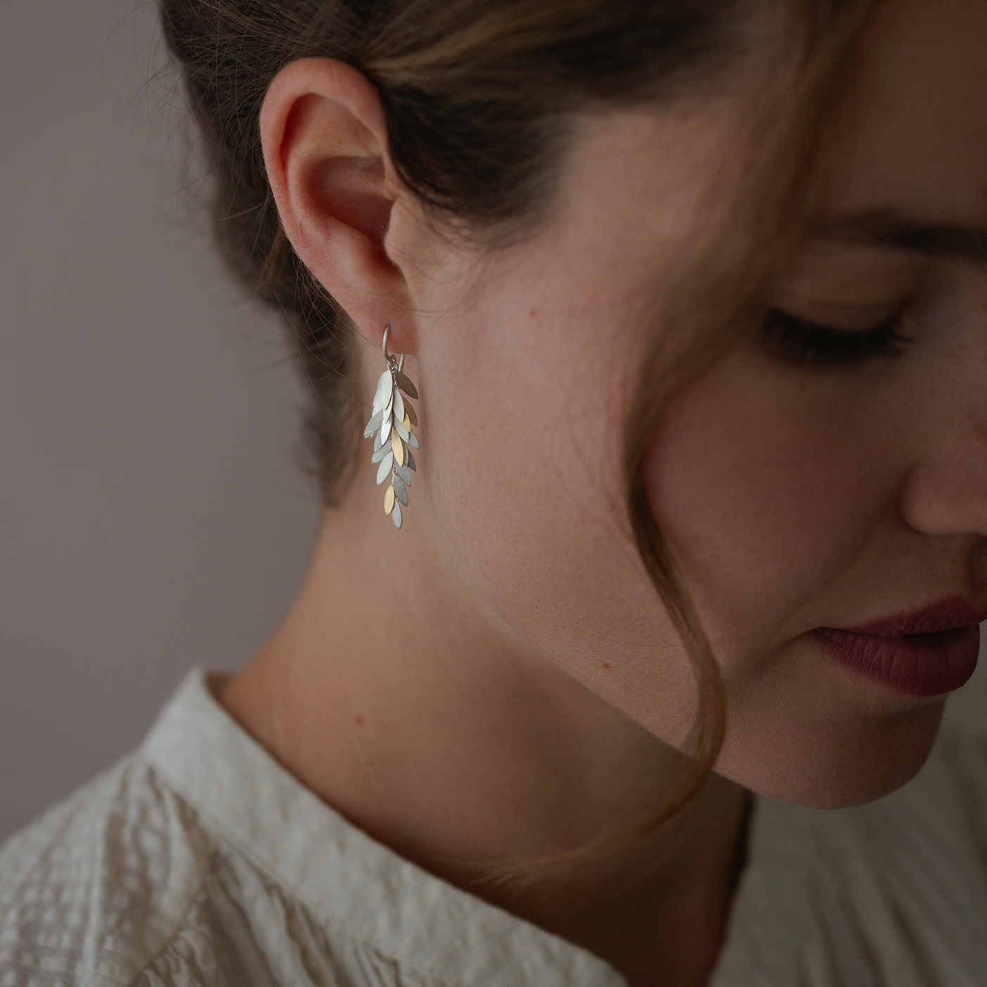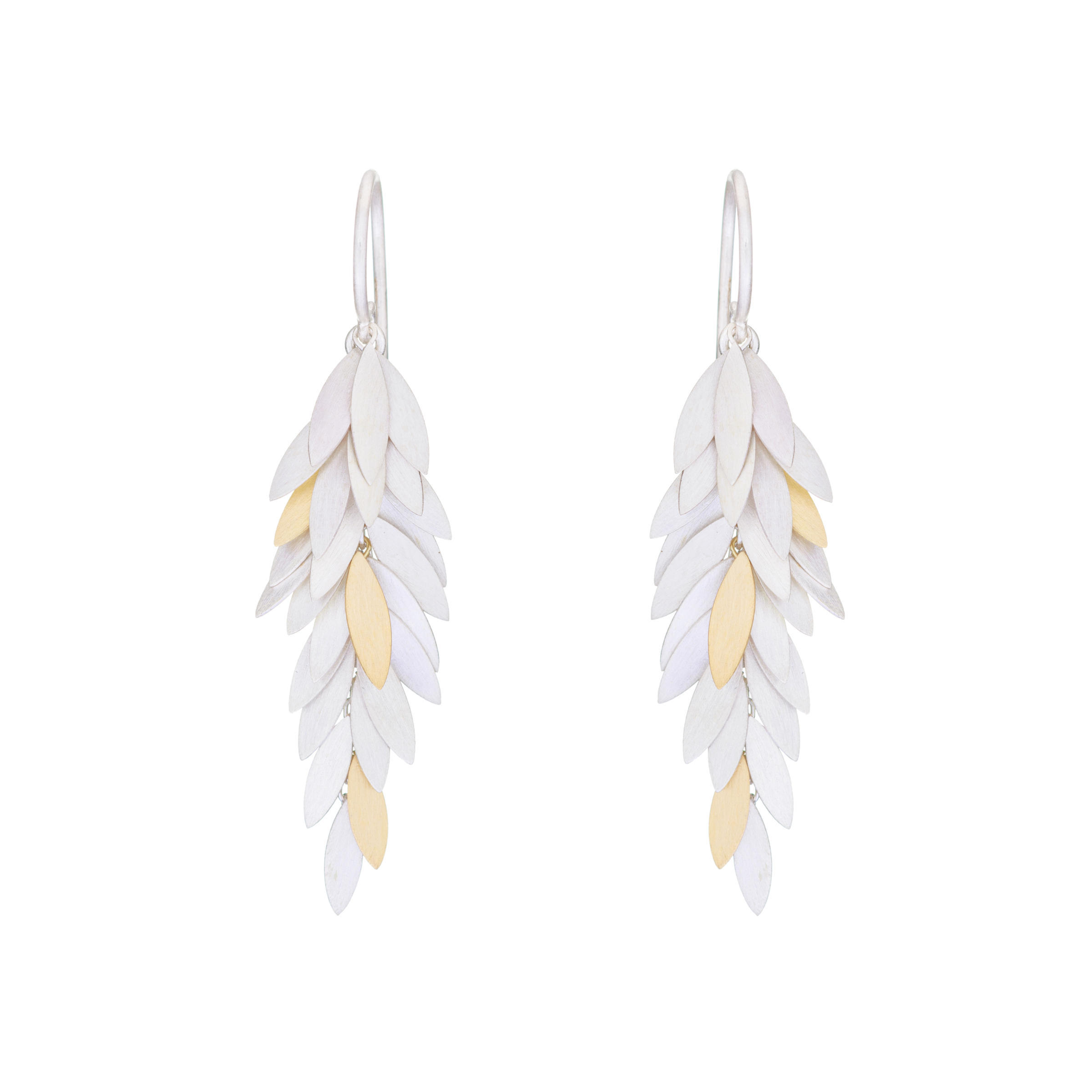 A cluster of silver and yellow gold leaves, hanging from a fine gold ear wire. The leaves move individually.