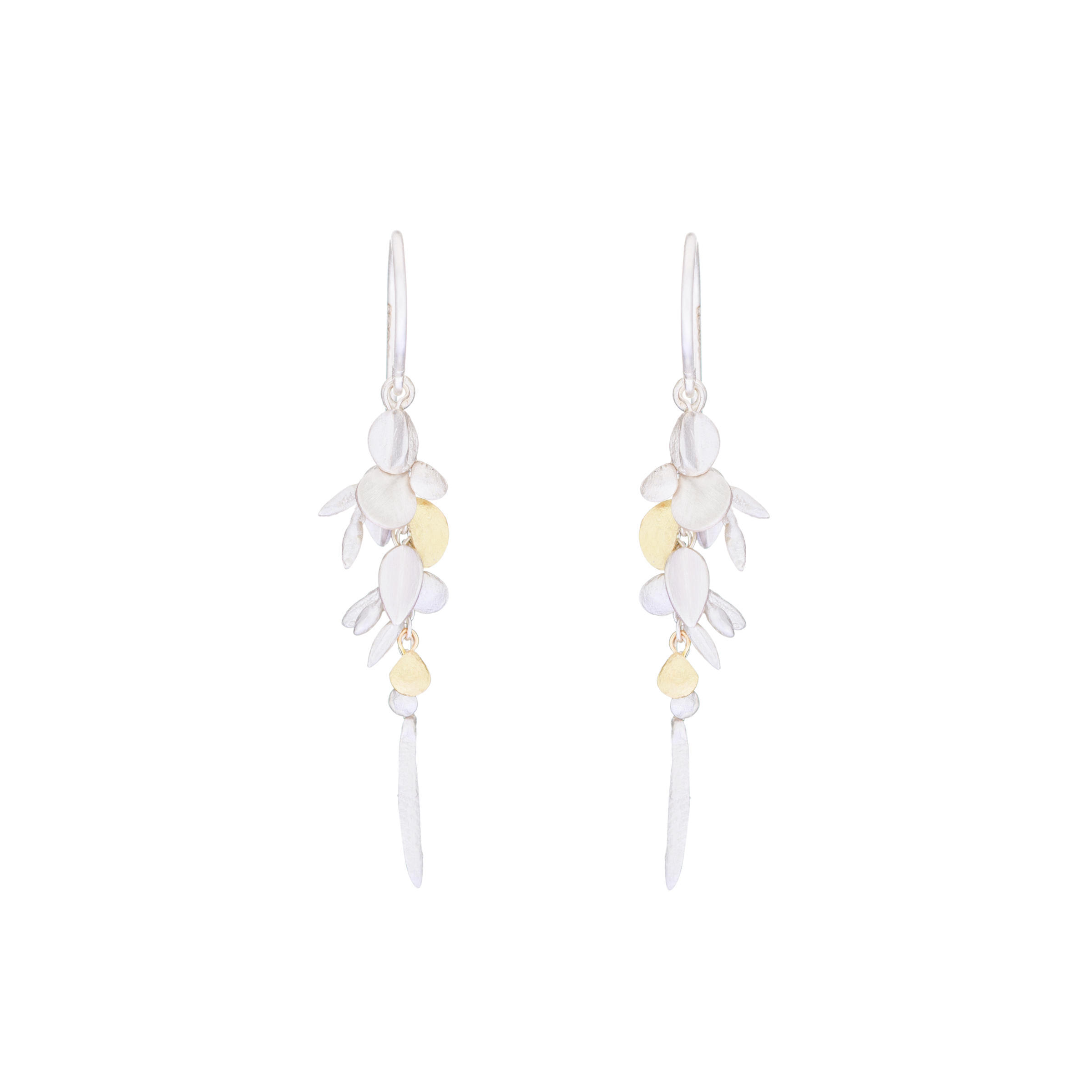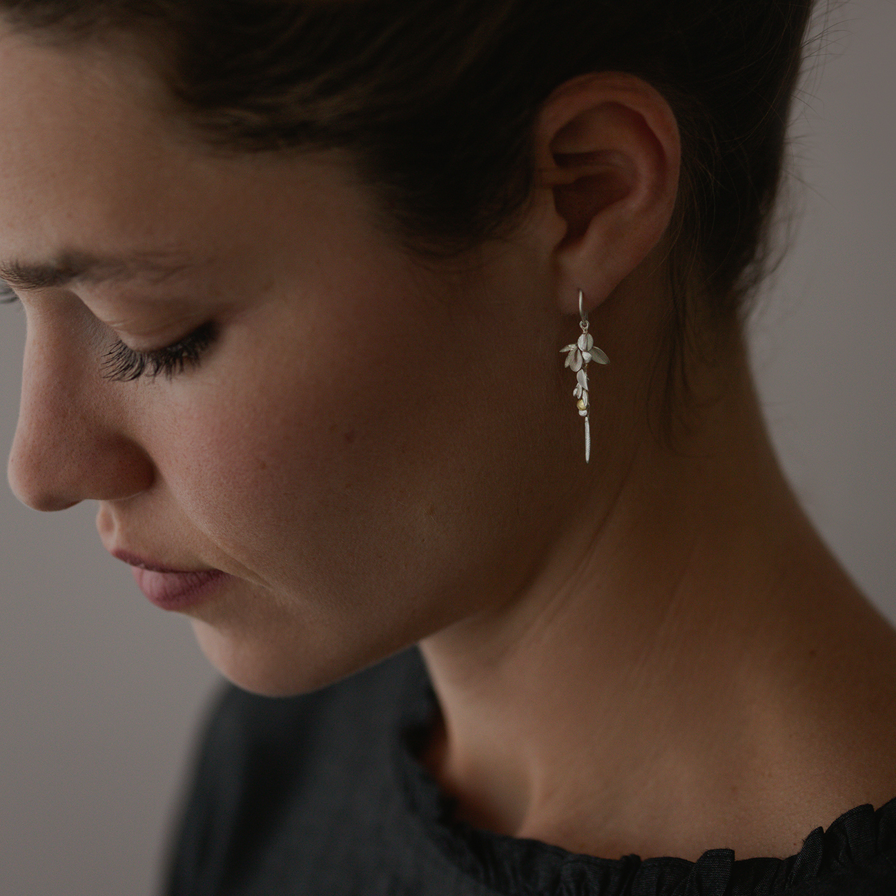 A delicate cluster of tiny silver pods, leaves, petals and yellow gold seeds.