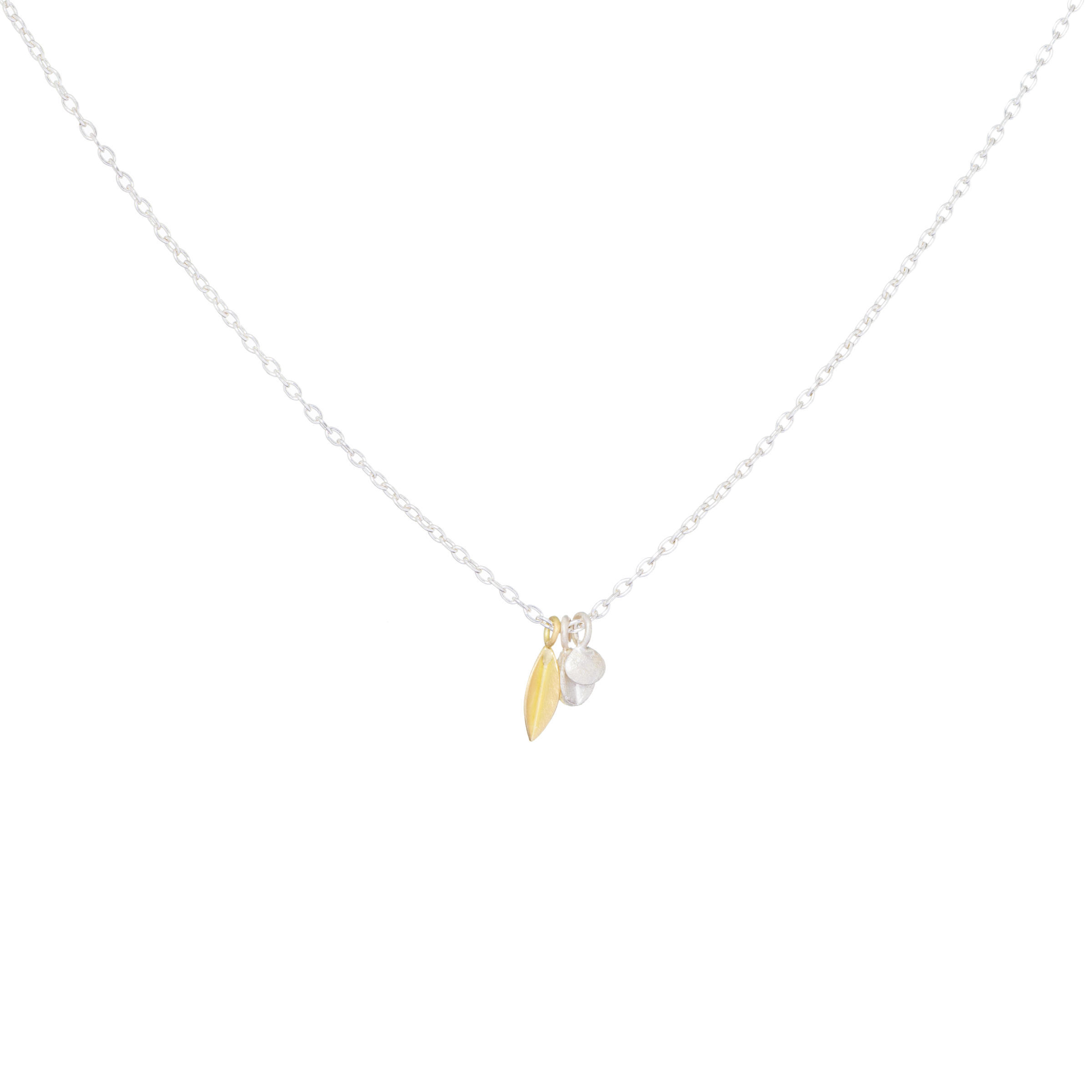 A tiny golden leaf, silver pod and seed freely moving on a fine gold chain.